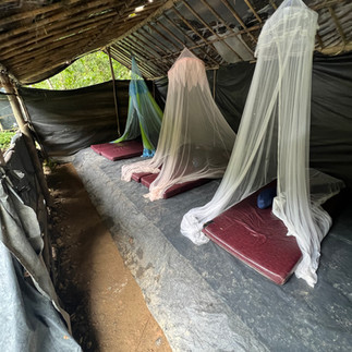 Das Camp liegt am Fluss, an einer Kurve, sehr märchenhaft, umgeben von Grün. Makaken schlängeln sich über unseren Köpfen von Ast zu Ast und das Plätschern von Wasser lässt einen friedlich werden. Insgesamt sind wir überrascht. Aus Holz und (leider Plastikplane) wurden Hütten gezaubert, die für mehrere Personen zum Schlafen dienen. Auf dem Boden liegen Matratzen, darüber sind Fliegennetze gespannt. Weiter unten gibt es eine Hütte, die als Ess-Küche dient. Interessant war die Toilette, die leicht abgehangen, unter freiem Himmel, in einer (einsehbaren) Ecke war. So viel: Makaken über dir, Menschen konnten vom Weg deinen Kopf sehen und bei Starkregen eher unangenehm :D Aber auch sehr lustig - vor allem nachts :) Das war dank einer Stirnlampe* aber kein Problem. Wir müssen sagen, dass wir aber auch eher dankbar für die Toilette waren - ich meine, wir sind ja immer noch im Regenwald von Sumatra!